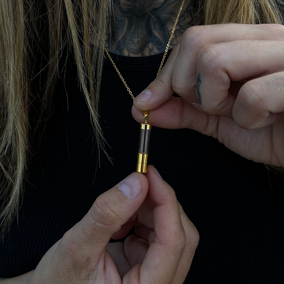 Our Amore Memento Necklace will carry a photo of your favorite memory AND you can put anything of sentimental value inside of the capsule e.g. Sand, Ashes, Earth, or Fur etc.